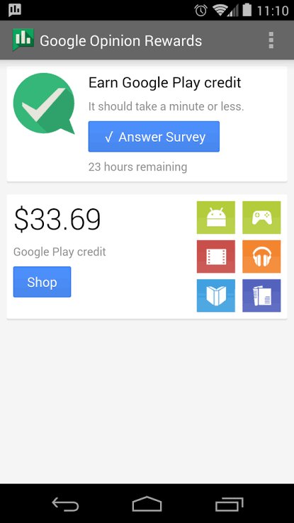 Answer surveys and earn Play credit!Answer quick surveys and earn Google Play credit with Google Opinion Rewards, an app created by the Google Surveys team. Getting started is easy. Download the app and answer basic questions about yourself. We’ll then send you surveys around once a week, although it may be more or less frequent. You’ll get a notification on your phone when a short and relevant survey is ready for you, and can receive up to ₹32.20 in Play credit for completing it. Questions can range from, “Which logo is best?” and “Which promotion is most compelling?” to “When do you plan on traveling next?”